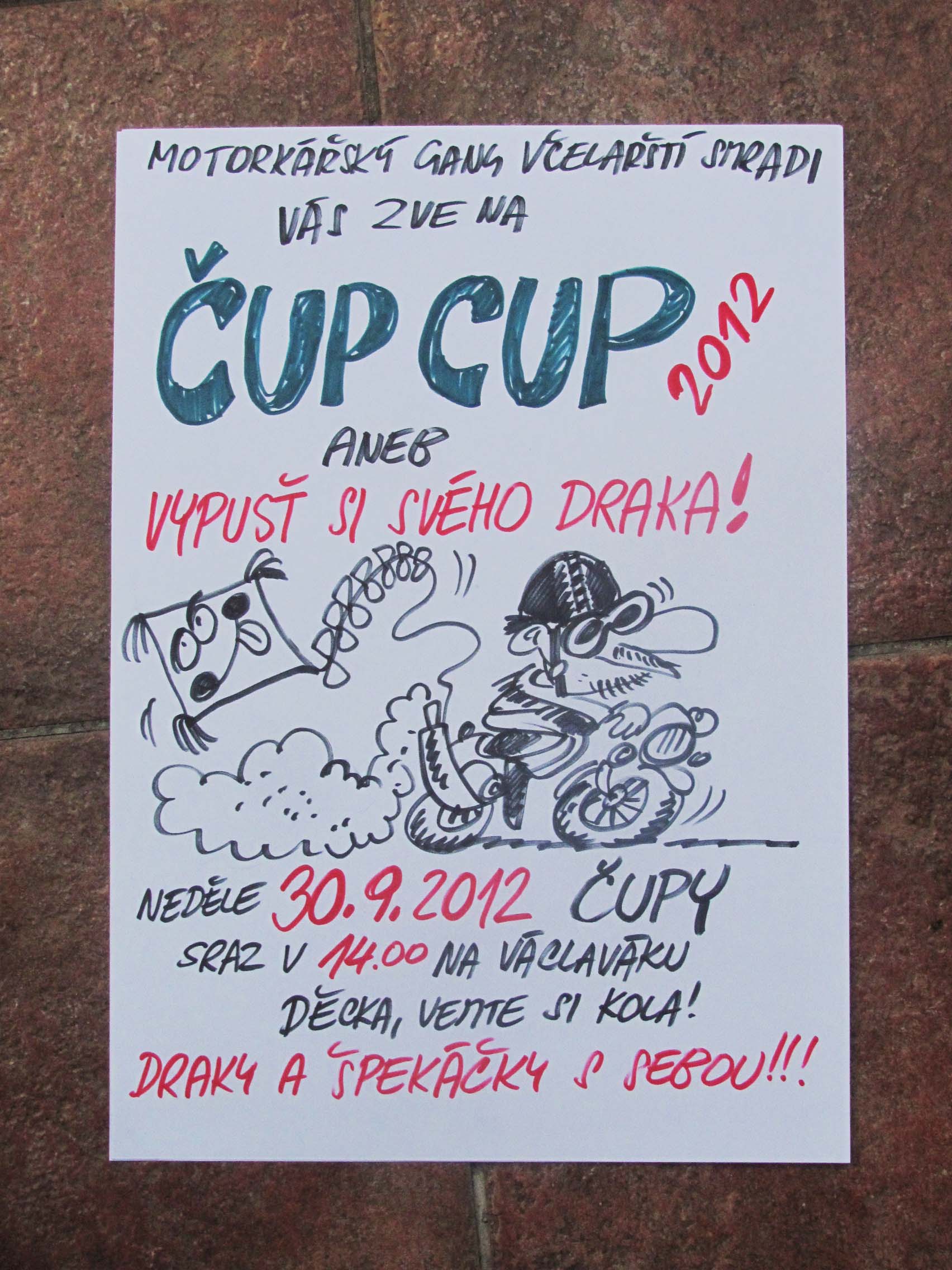 Pohoří Čupy nad vesničkou Včelary se stalo dějištěm závodu ČUP CUP 2012, které uspořádal místní motorkářský gang Včelarští smradi. Spanilou jízdu se startem od Václávského náměstí uvedl do chodu traktorová „sejftykára“, za jejíž volant zasedl prezident včelařské baňky Fanek Janků. Kolona za pekelného smradu a burácení motorů „prosvištěla“ vsí aby se vrátila na startovní čáru na Čupech. Tam je již očekával včelařský kníže Rostislav Blaha a mávnutím praporku a za přihlížení velkého davu diváků odstartoval štafetový závod asi patnácti mopedů a historických motokol. Drsní Včelarští smradi v kožených bundách, obetkaní řetězy a ozdobeni symboly lebek a pavouků se utkali v několika náročných disciplínách. Rovnoměrnými soupeřkami jim byly motorkářky-ženy, přezdívané Včelarské voňavky. Tu samou trasu ale absolvovala i motorkářská omladina tzv. Včelarští tvarůžci, pro zatím sice jen na kolech ale se stejnou vervou. Odměnou všem pak byla památeční medaile. Poté včelařské nebe zaplnilo velké množství draků, zavoněl svařák a vůně špekáčků. Poháry vítězům rozdal prezident VS Oťásek Kročil. Třetí místo obsadil Antonín Kmín Štefánek jako cenu útěchy. Jeho stroj se během závodu téměř celý rozsypal, přesto ho borec dokázal po částech dostat do cíle. Stříbrnou metu získal ing. Radovan Neten Janků za to, že v podstatě celý závod na svém francouzském veteránu Velosolex odšlapal. Zlatý putovní pohár pozvedl do výše kreslíř Ivan Křemeček a důvod byl, jak prohlásil prezident VS Kročil, za založení bláznivého motospolku a spoluzorganizování závodů. Mezi povinnosti vítěze patří mimo jiné mít vždy otevřené dveře kolegům z gangu a v případě potřeby jim do strojů doplnit nádrž benzínem až po okraj, nafotit erotické fotografie se zlatým pohárem. „Nebyla to pouze moje zásluha,“ řekl vítěz, „za založením gangu a ČUP CUPEM stojí všichni členové spolku, …a proto ty erotické fotografie nafotíme společně!“