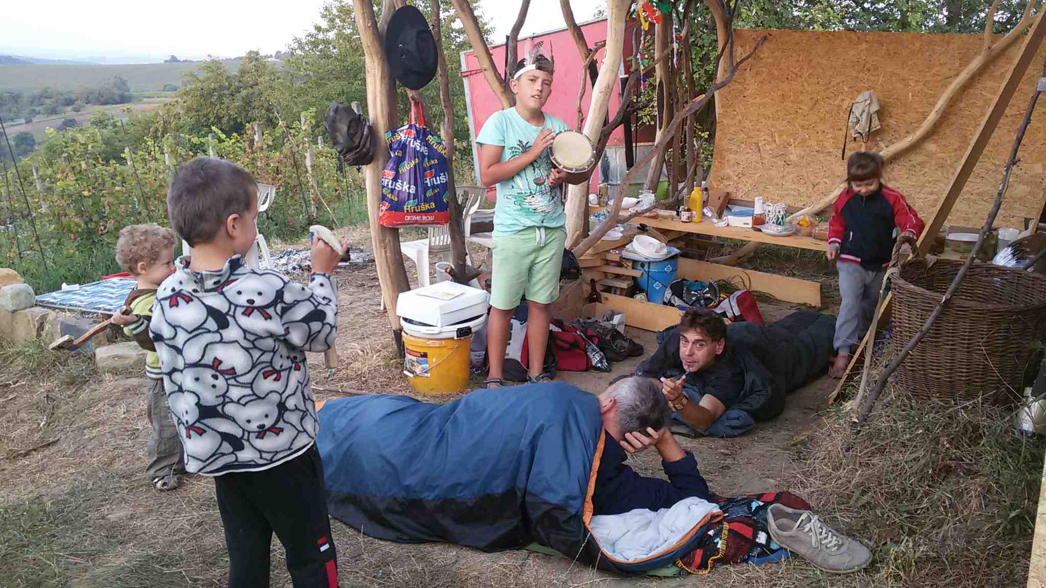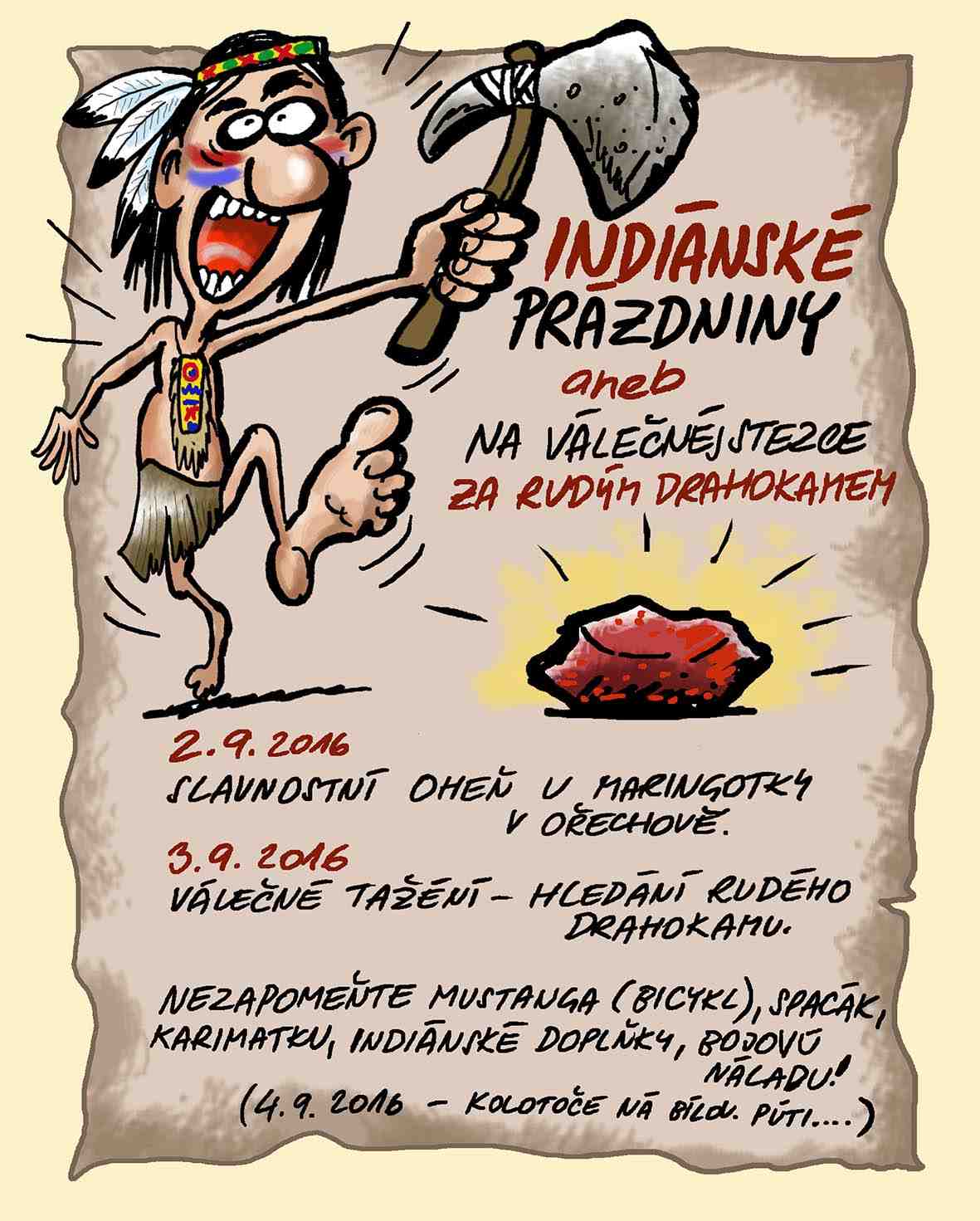 PUTOVÁNÍ ZA RUDÝM DRAHOKAMEM …vykopání válečné sekery a dobrodružné putování neznámým územím, plným záludných nebezpečí, za každým rohem ukrývajících se podlých bělochů a zákeřných ale někdy i velmi přítelských indiánů, šerifů s ohnivou vodou, krkolomným průjezdem poslední rezervací Zlínského kraje, až po nalezení vzácných rudých drahokamů a poté zaznění oslavných indiánskýchj tanců a zpěvů u hlučných tam-tamů a uširvocích indiánských diskoték až po zakopání válečné sekery a vykouření dýmky a uzavření míru u rozzářených ohňů a ohňostrojů při usínání spokojených a mírumilovných indiánů… howgh!