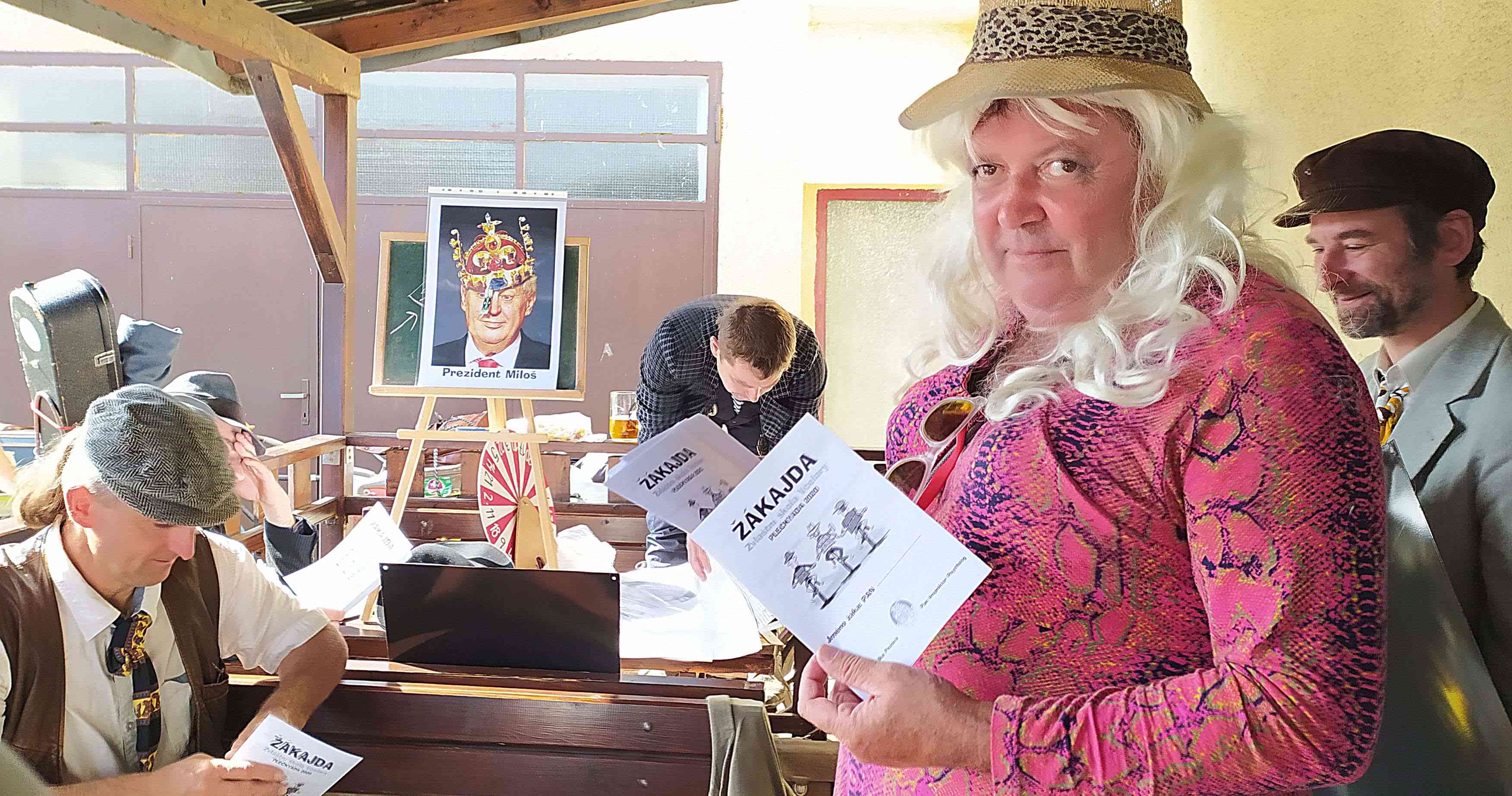 zádech a v čele s paní učitelkú (přeslečený plečkař za babu